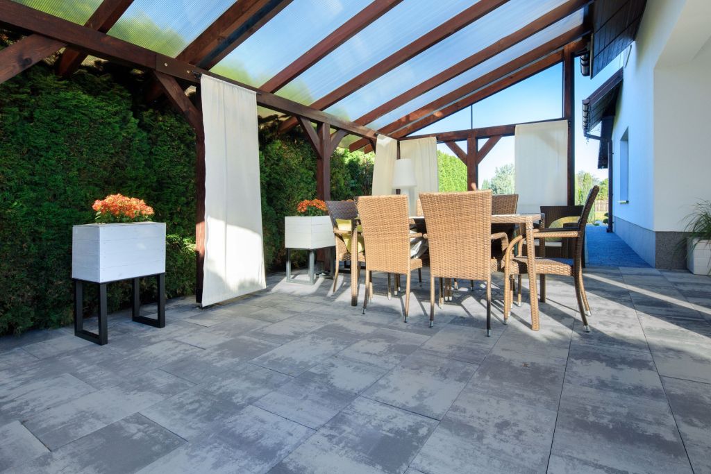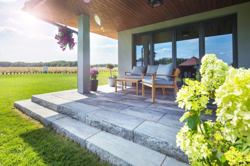 Większość domów wybudowanych w stylu nowoczesnym posiada minimalistyczną, kwadratową bądź prostokątną bryłę i duże przeszklone powierzchnie w obrębie salonu. Elewacja najczęściej jest wykańczana białym tynkiem lub malowana na odcienie szarości. Strefa wejścia do budynku często ozdobiona jest okładziną drewnianą lub drewnopodobną, a niekiedy blachą kortenowską. Prosty, wręcz ascetyczny wygląd budynku sprawia, że jego otoczenie powinno mieć podobny charakter. Kostki i płyty betonowe należy dobrać nie tylko pod względem estetycznym, ale również użytkowym, w oparciu o bardzo prostą zasadę – im grubszy prefabrykat betonowy, tym szersze zastosowanie. Im cieńszy, tym węższe. Płyty o grubości mniejszej niż 6 cm zastosujemy jedynie na tarasach i alejkach ogrodowych, zaś równych lub grubszych – w praktyce na wszystkich innych nawierzchniach w otoczeniu domu, przy czym przeznaczenie danego produktu trzeba zawsze sprawdzić w tzw. Deklaracji Właściwości Użytkowych produktu. Przegląd dostępnych na rynku rozwiązań najlepiej rozpocząć od tarasu, czyli zwykle najważniejszego miejsca spotkań w ciepłe dni.