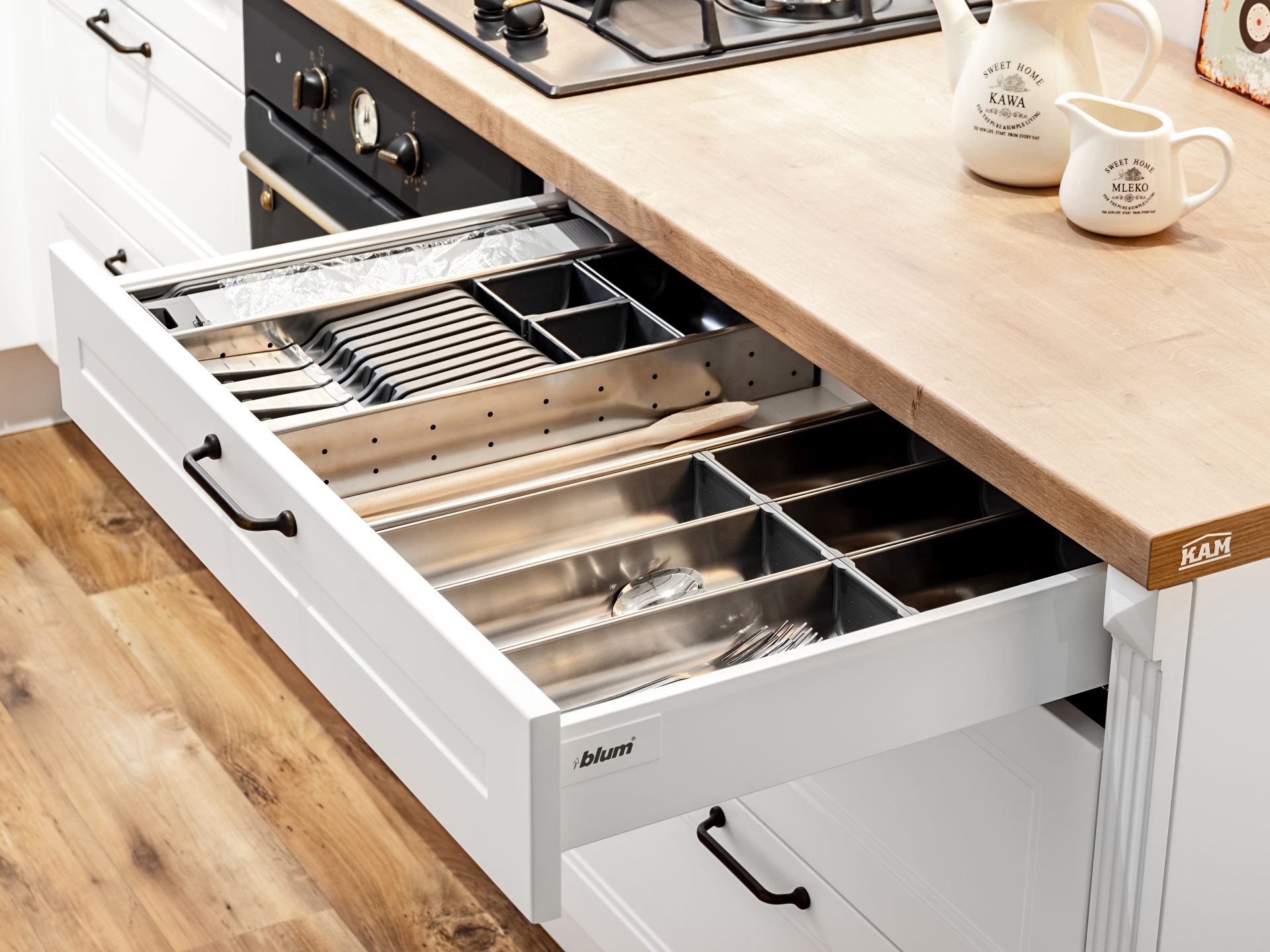 – Szuflady powinniśmy dopasować nie tylko do metrażu kuchni, ale zacząć od przemyślenia, jak będziemy z nich korzystali i od tego uzależnić ich ilość w zabudowie meblowej oraz wysokość każdej – wyjaśnia Sylwia Kowalska-Mikutel, projektantka Spółki Meblowej KAM. – W ten sposób efektywnie zagospodarujemy naszą strefę przechowywania i wszystko znajdzie się na właściwym miejscu. Ułatwi nam to pracę w kuchni, a dodatkowo pomoże utrzymać nienaganny porządek.